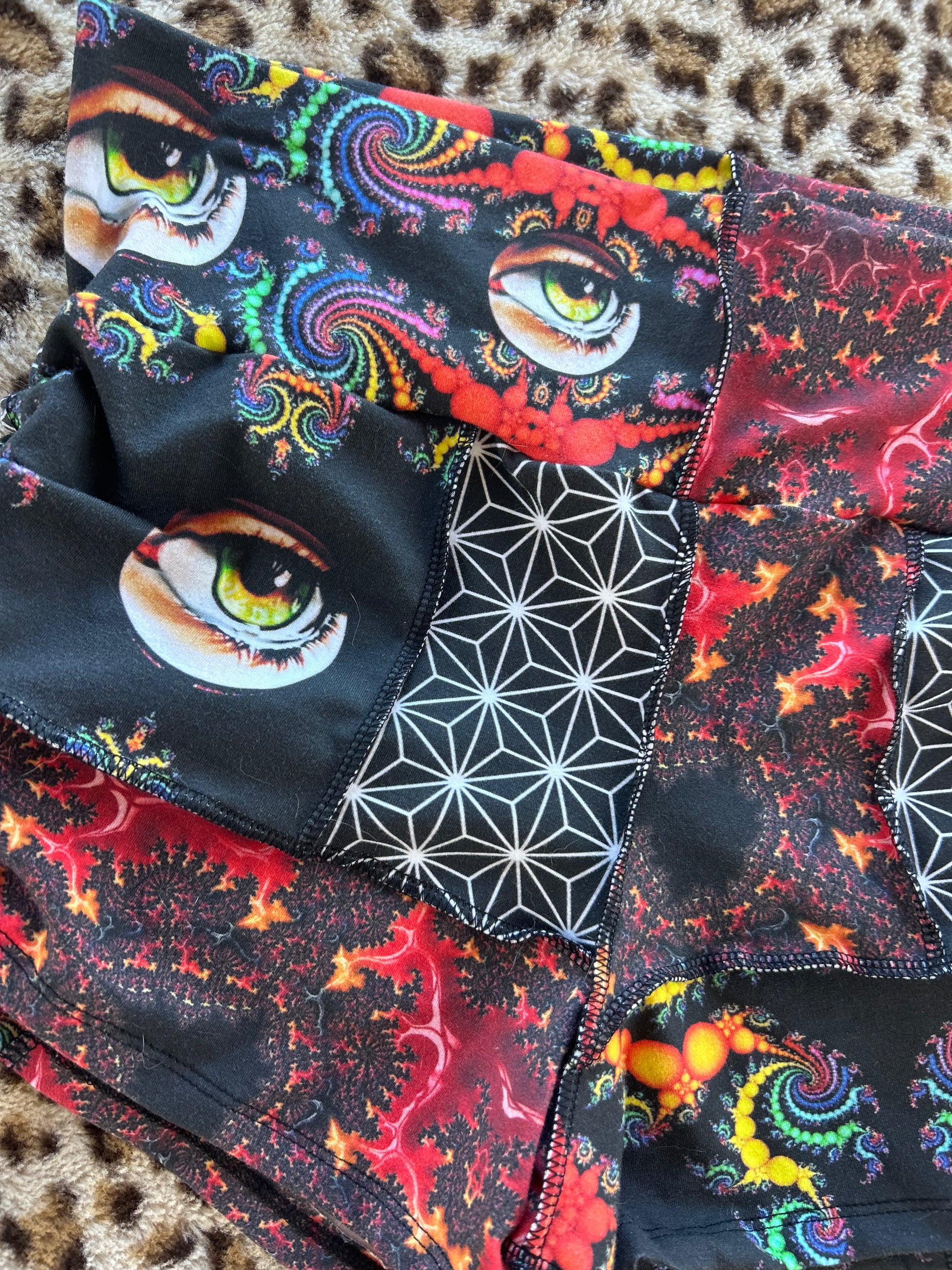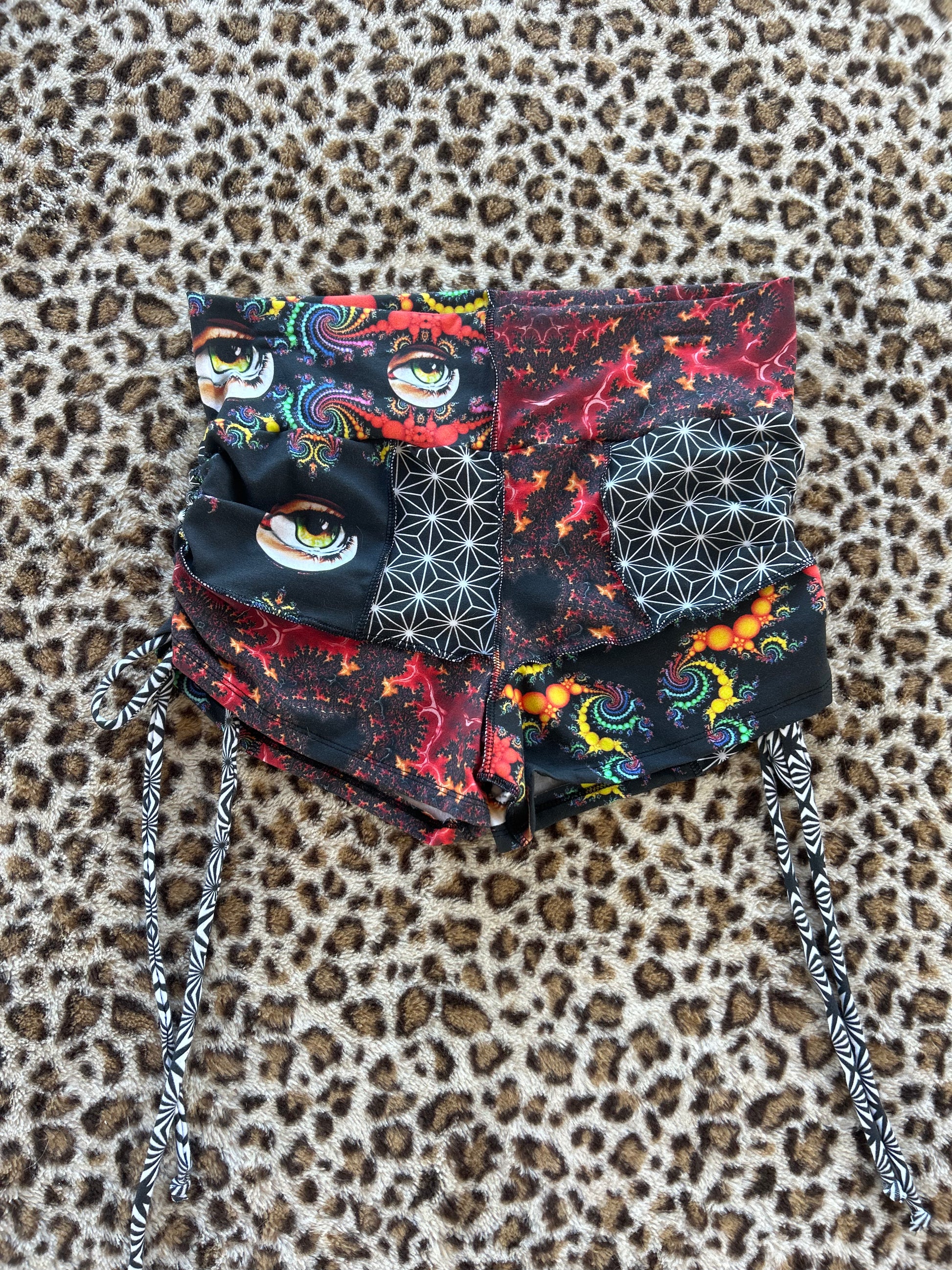 Super cute patchwork shorts with cinch ties on the side! Can we worn tied in a simple bow or around your legs for a garter look :) Specify the fabrics you want in the notes section of your order or pick one and Maggie will select matching ones! Please also leave your waist/hip measurements.