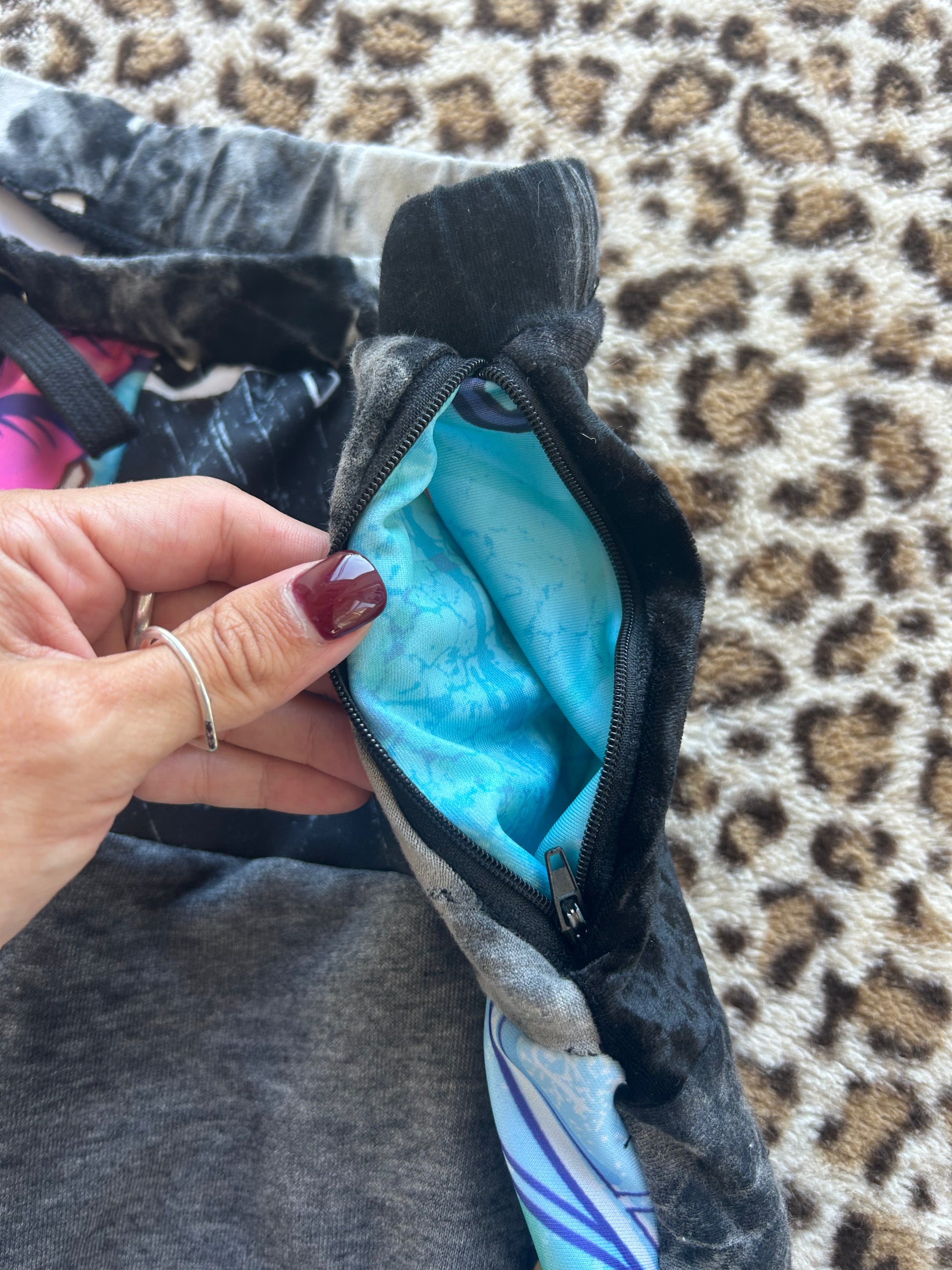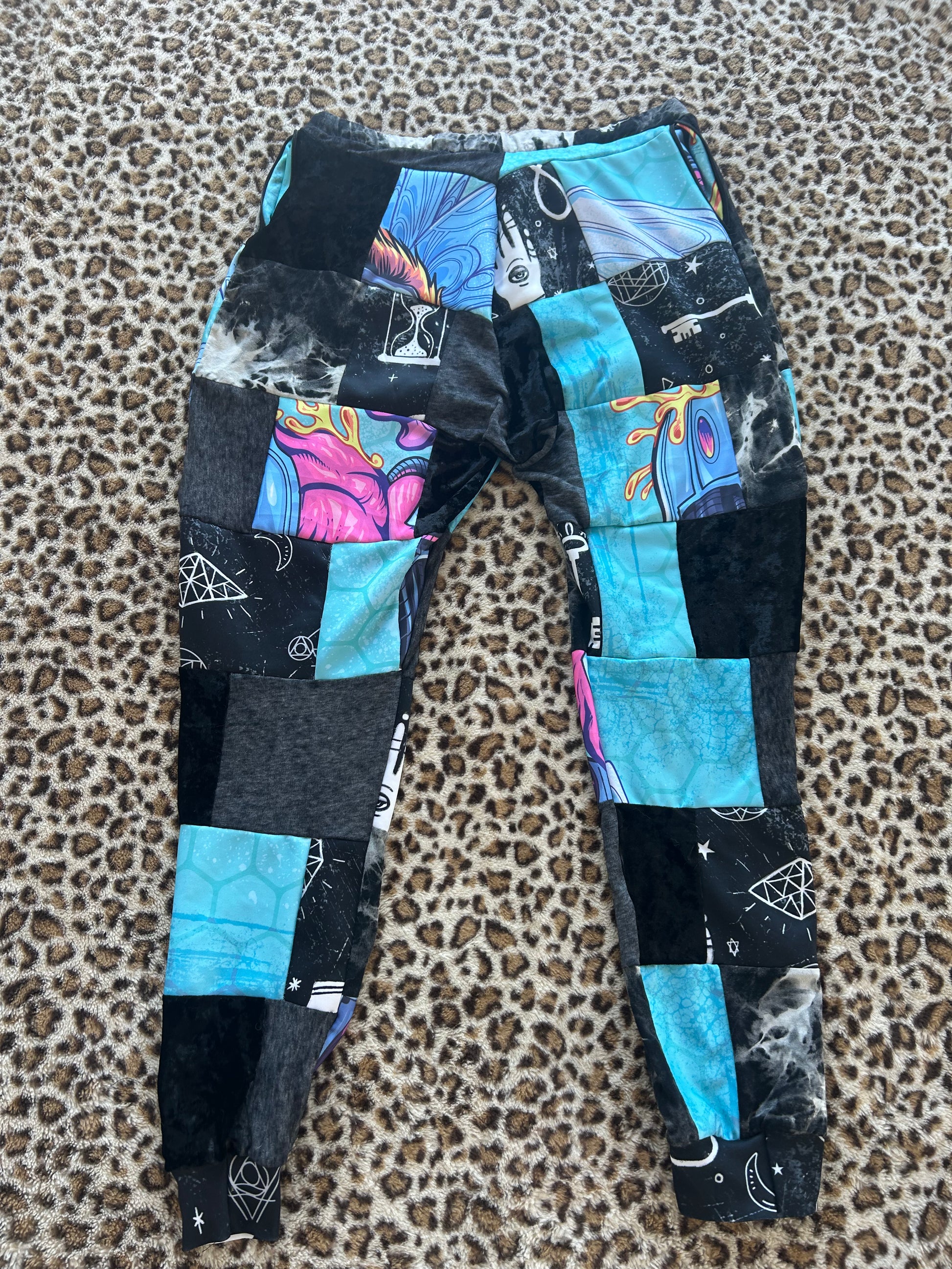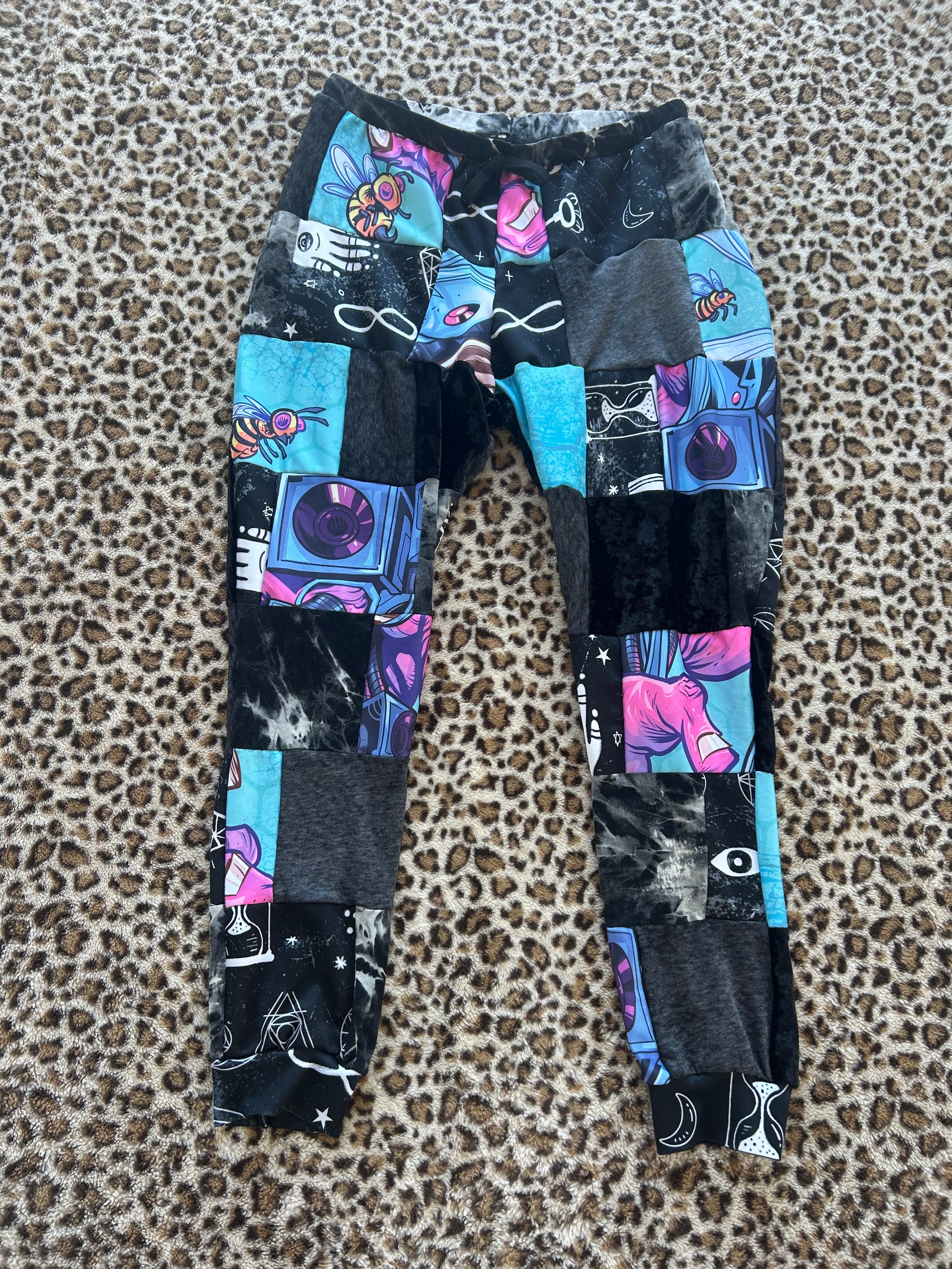 Size L/XL Patchwork Joggers! Completely up-cycled with zippered side pockets! So fun!