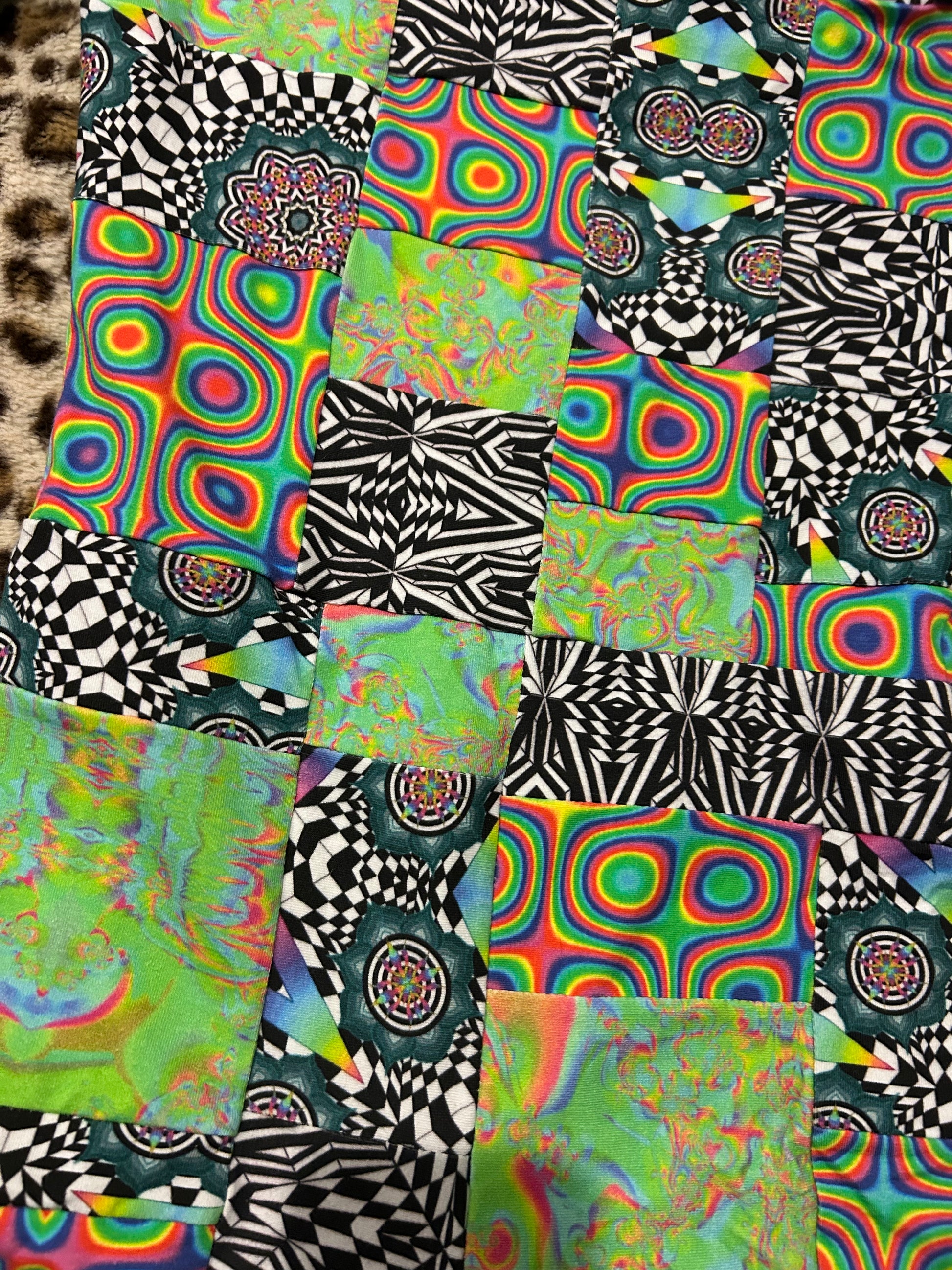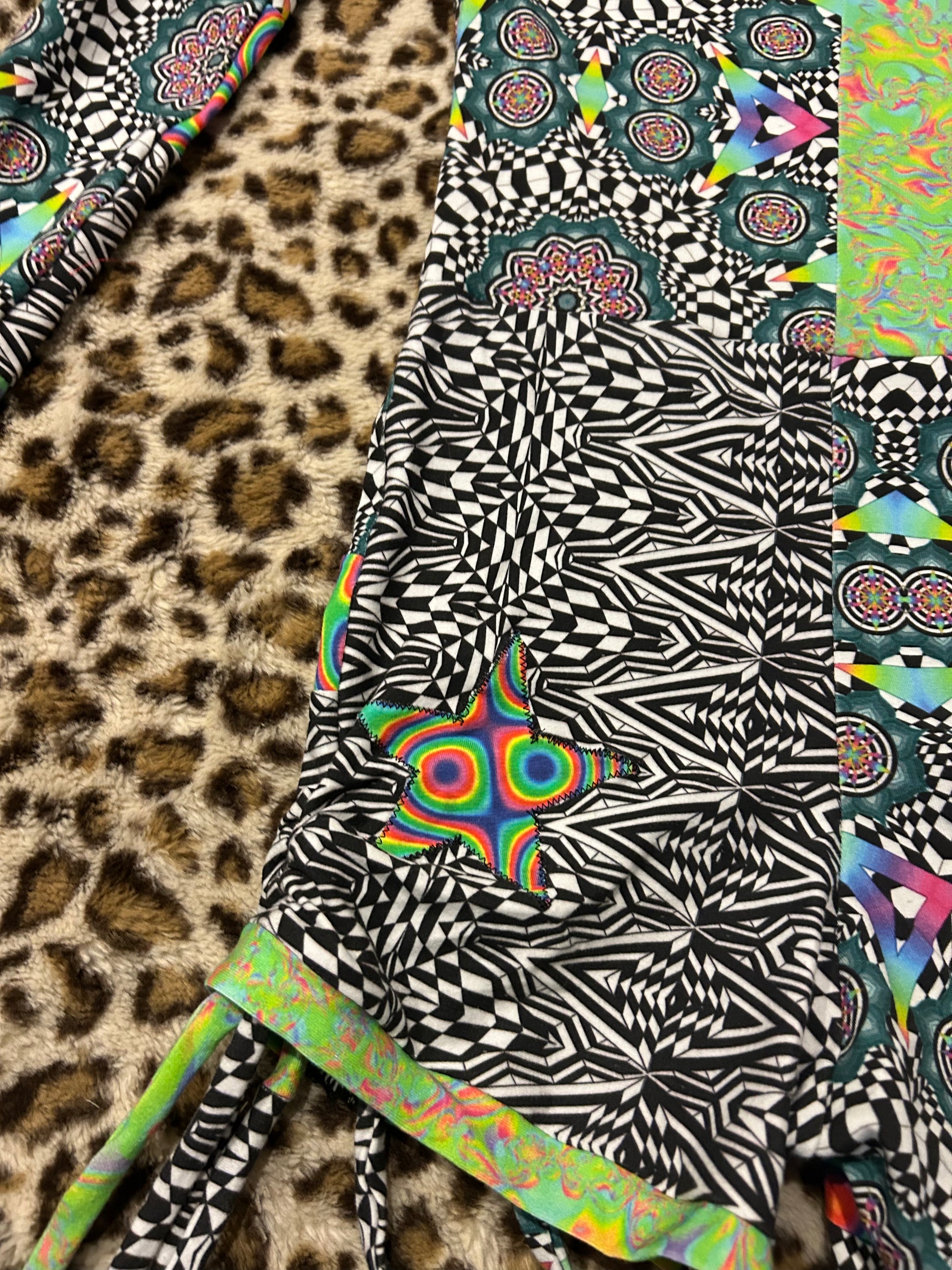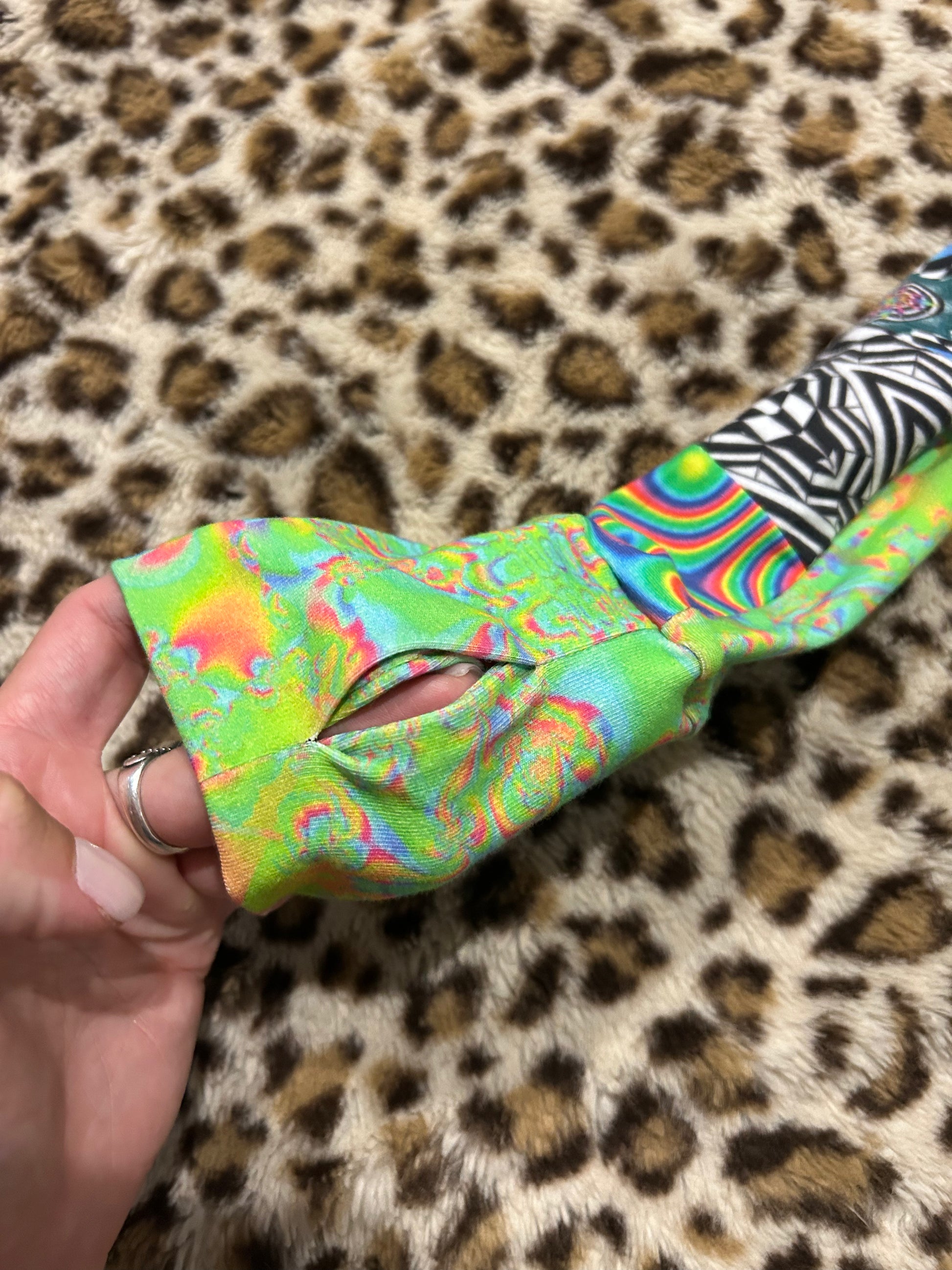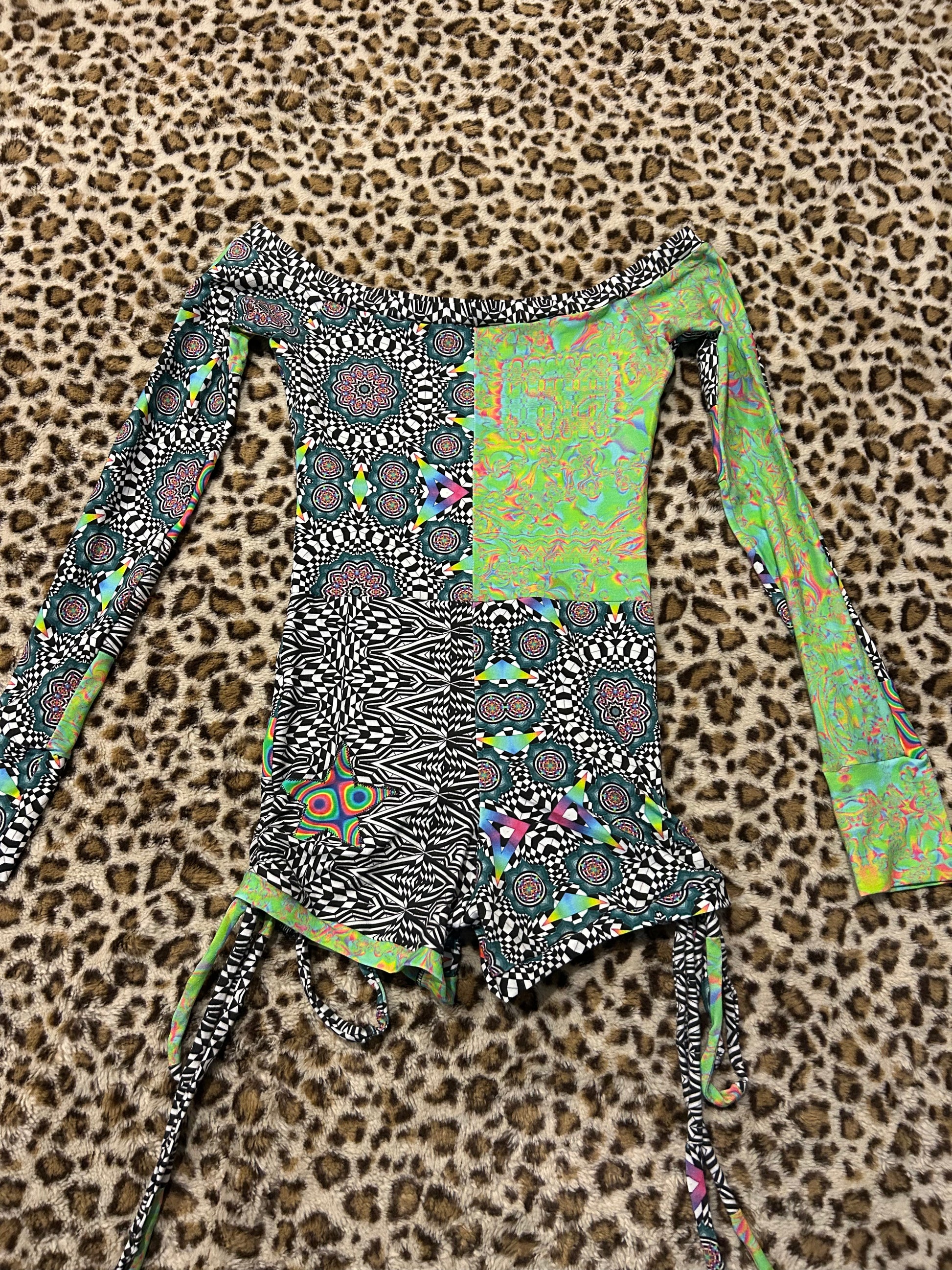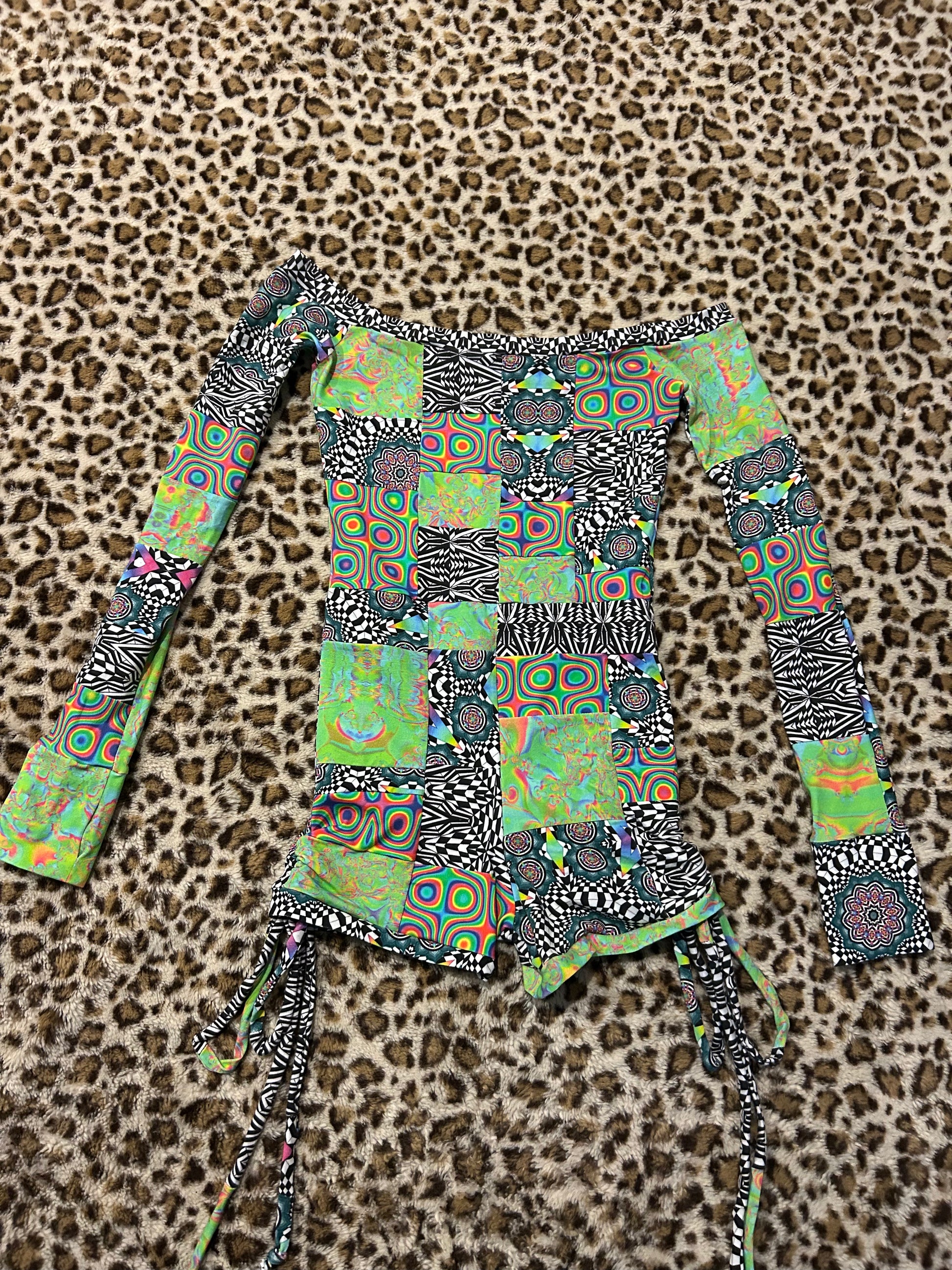 Super fun patchwork playsuit made with Zayo fabrics :) this has seamless thumbholes, cinches on the side made out of patchwork strings, and star detailing on the booty!