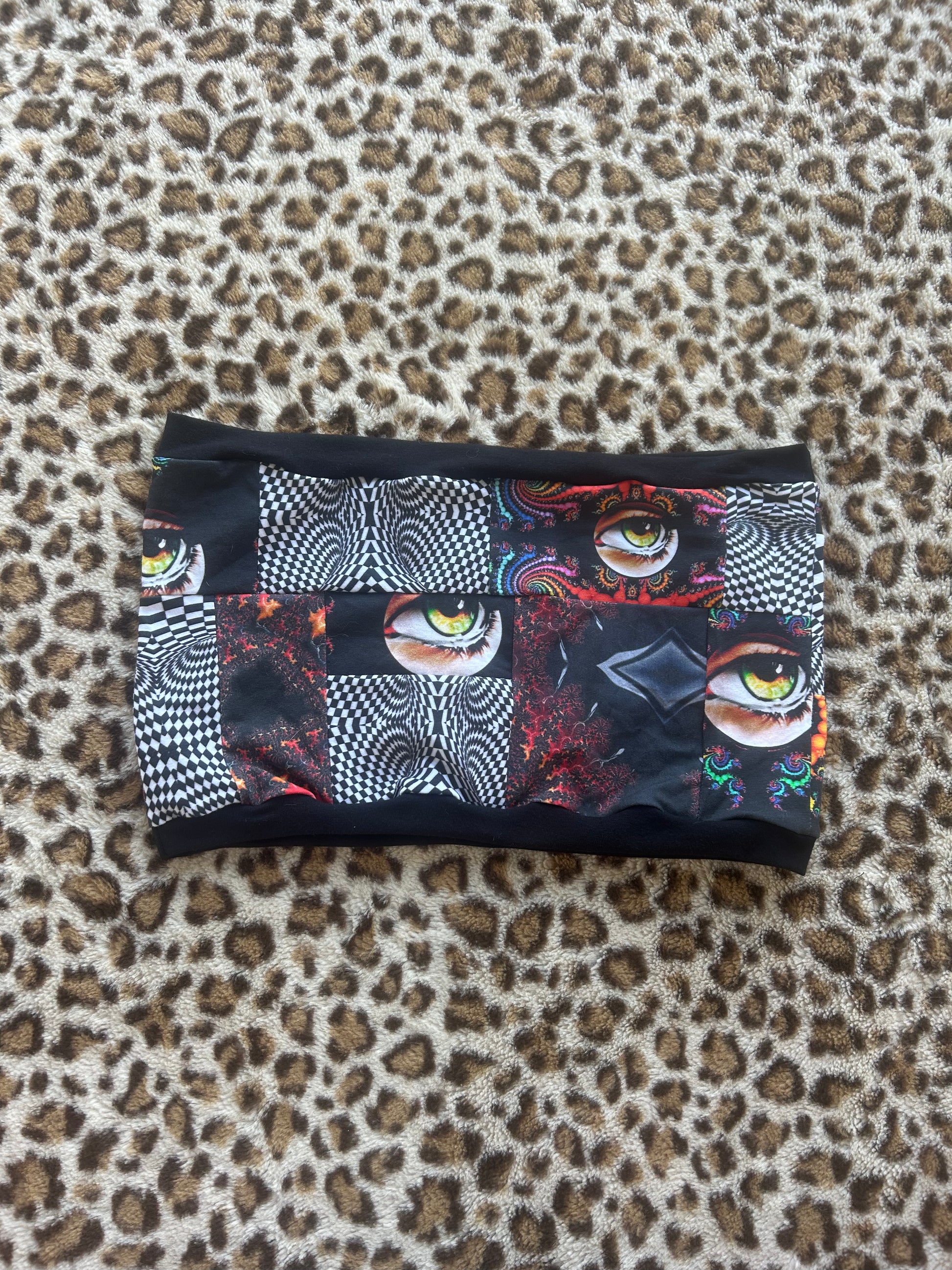 Red/black patchwork tube top! Top band measures 30" and bottom band measures 28" (bands will stretch up to 5"). Middle section is 32" and will stretch as well!
