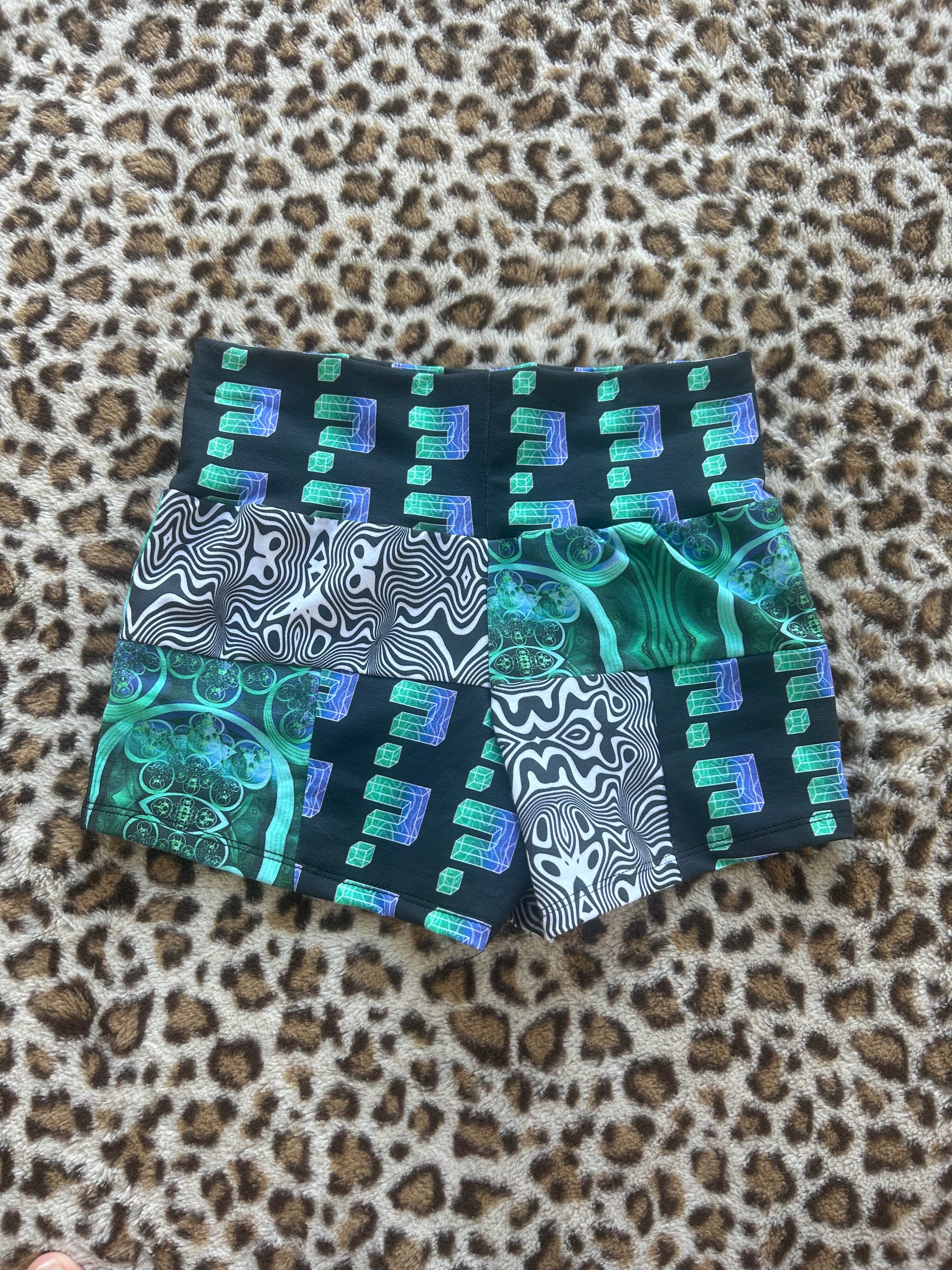 Super cute patchwork yoga shorts! These would best fit size XS/S, waist is 24" and will stretch up to 3-4"
