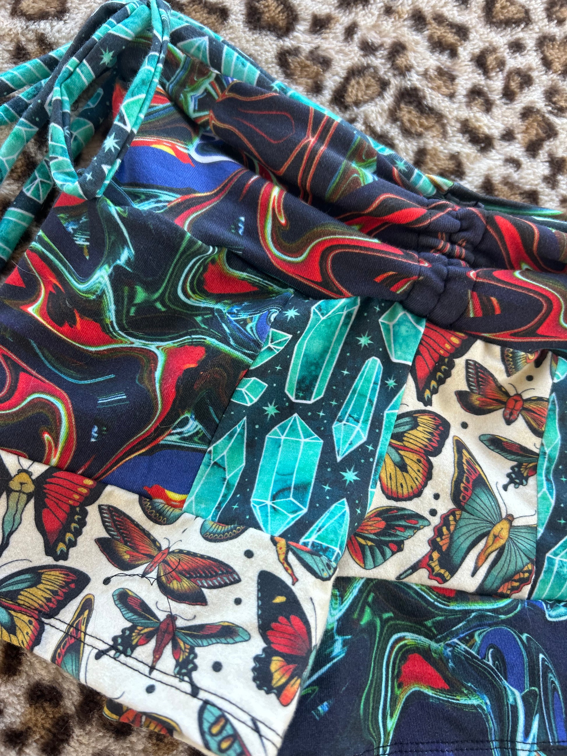 XS/S cinched waist patchwork shorts. Waist measures 24" and would best fit 26-28" waist and 33-37" hips.