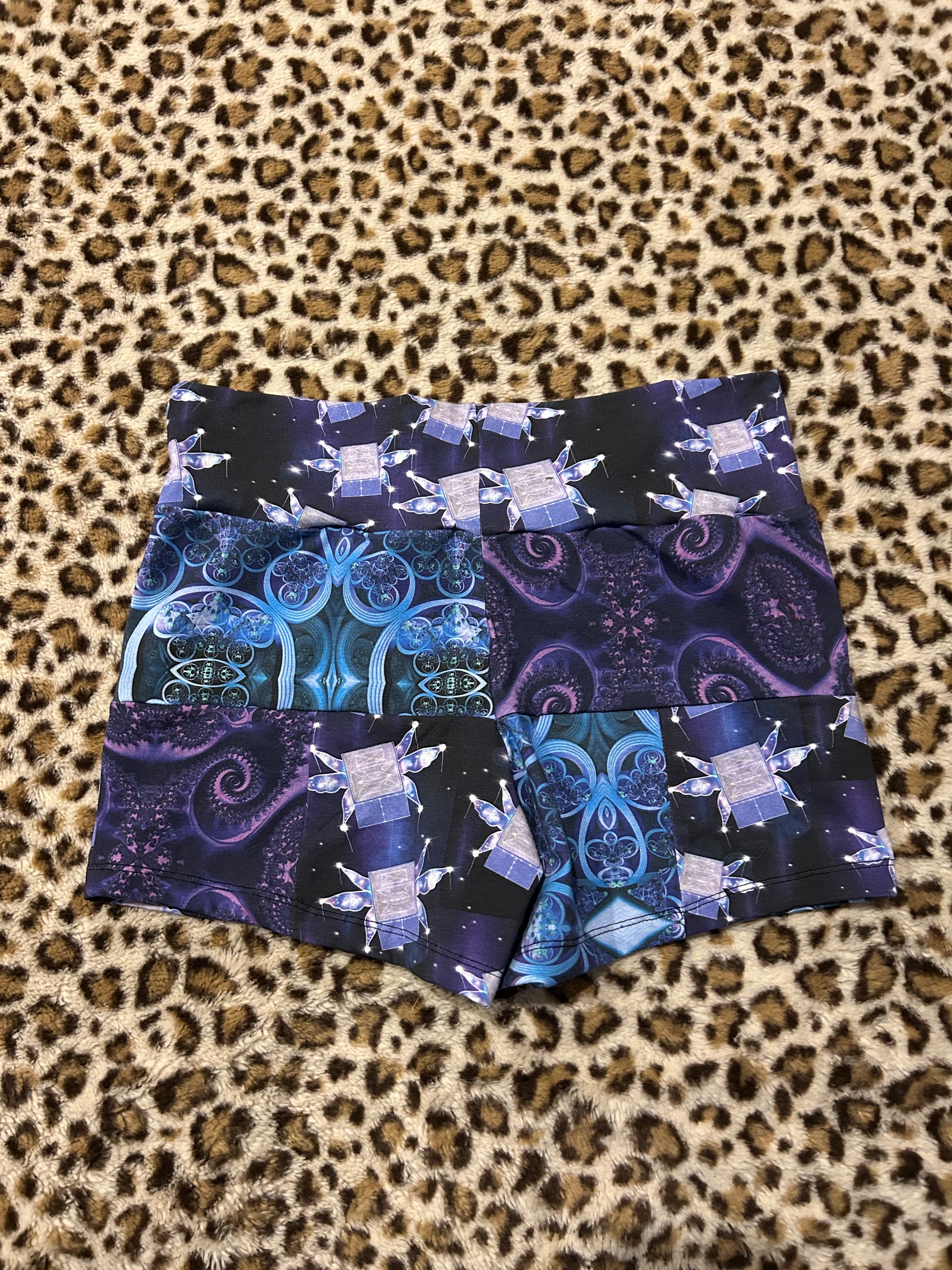 Super cute purple/blue patchwork yoga shorts. Would best fit 30-33" waist and 40-43" hip!