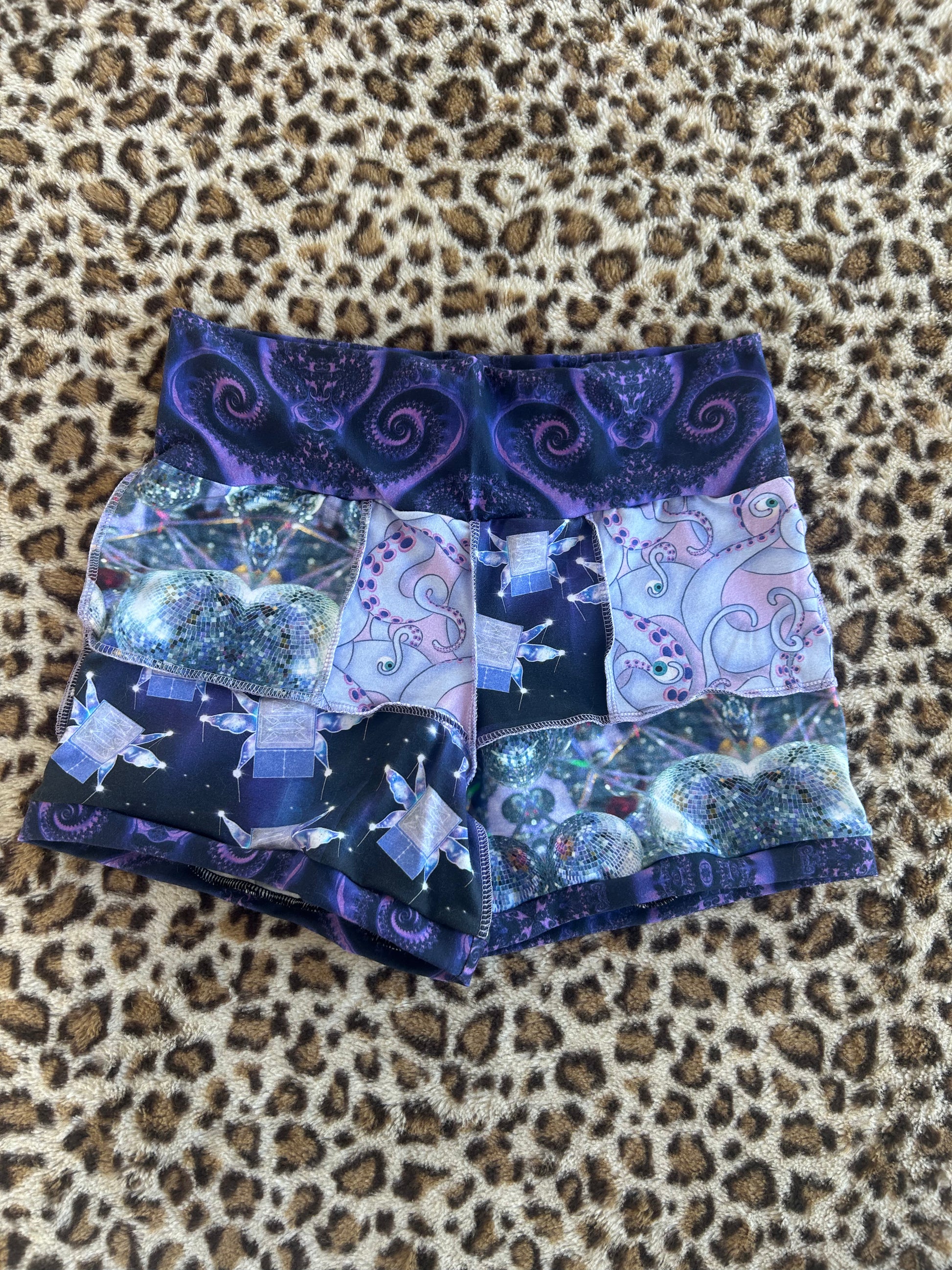 Purple patchwork yoga shorts! Did the stitching on these with light purple as well for a cute detail :) Waist would best fit 29-31" and hips 36-39"